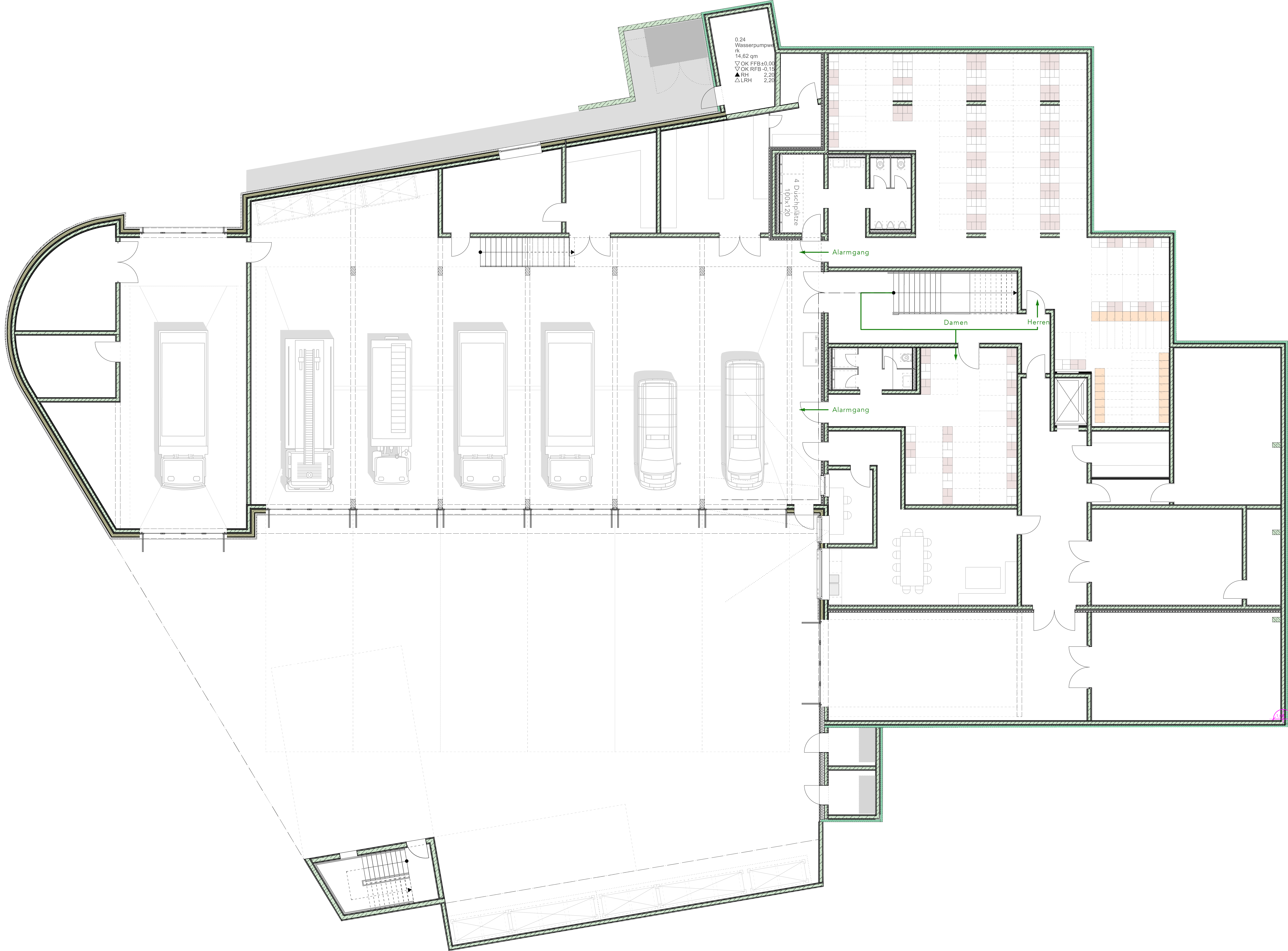 The new building in Rudersberg is home to both the volunteer fire department and the German Red Cross. There are six indoor parking spaces and an additional, separate washing area for the fire department, while the hall for the German Red Cross has four parking spaces. The required ancillary rooms, storage and changing rooms are assigned to both halls. Some parts of the three-storey building, such as the training room with kitchen, which is accessible via a shared foyer, are used by both units.