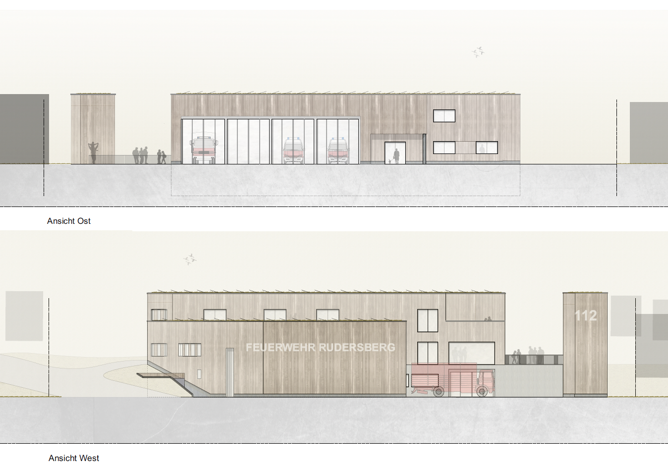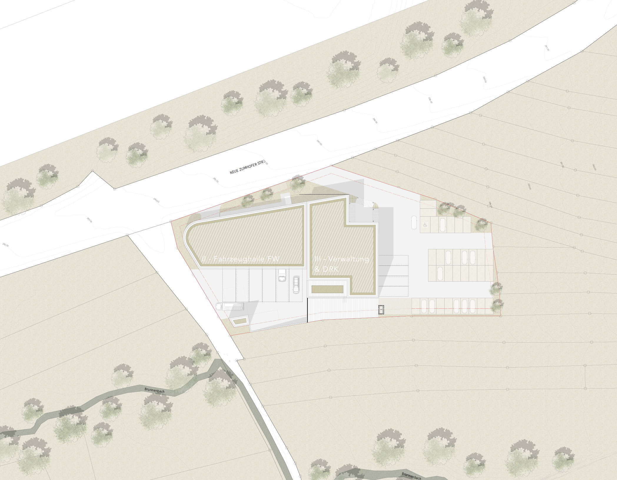 In Rudersberg, a joint new building is to be constructed for the volunteer fire department and the DRK. We have designed a versatile building that creates separate courtyards for both uses and makes the existing site its own.