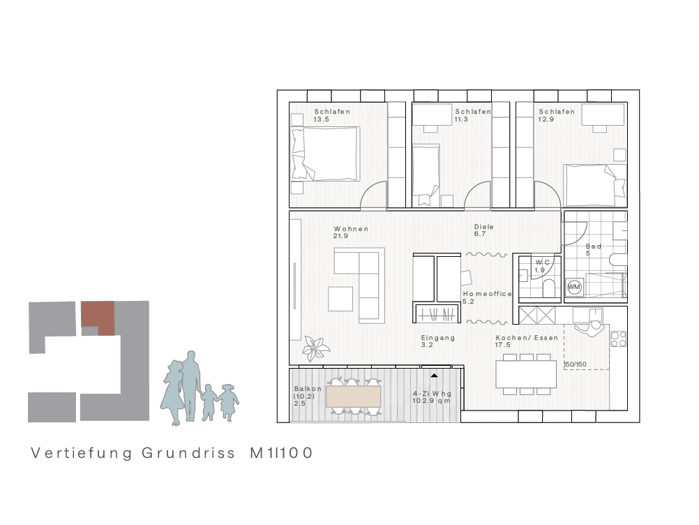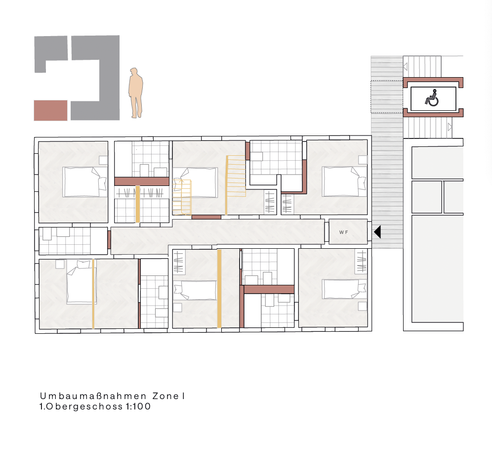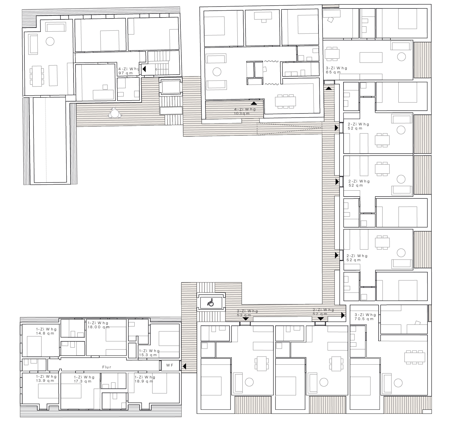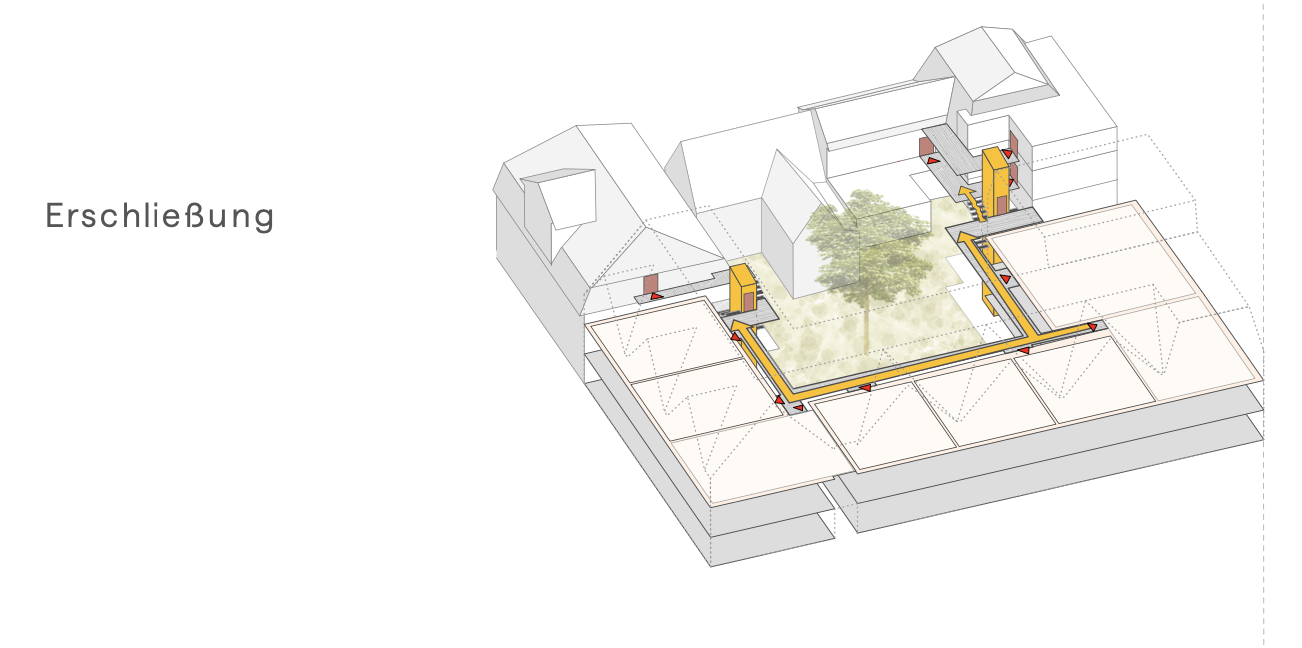 The apartments are organized in such a way that cross-ventilation and through-living are possible. Kitchens and wet rooms are located on the courtyard side of the arcades and act as a functional buffer zone between private living and semi-public access. The arcades create a communicative level to the courtyard, while at the same time reducing the. at the same time as reducing the circulation areas and enabling compact structures with a high level of efficiency. The building in Zone I will also have 12 guest rooms, which will complement the residential offering and contribute to the revitalization of the quarter. These are also connected to the new access system and can be reached barrier-free.
