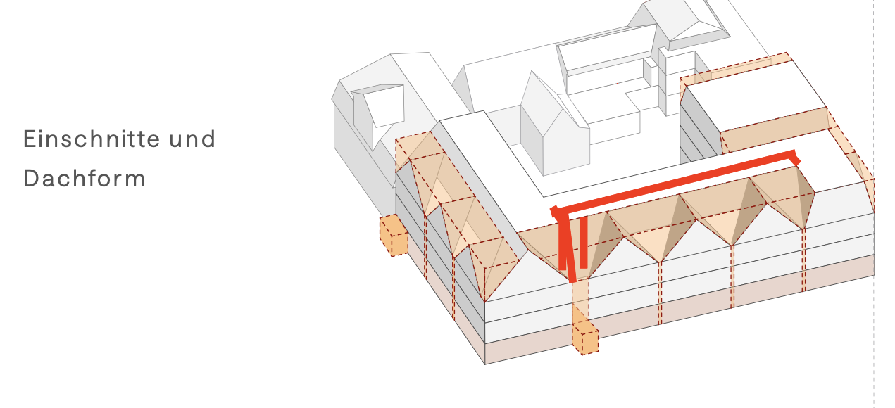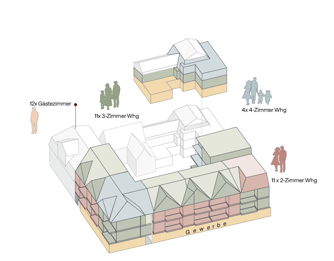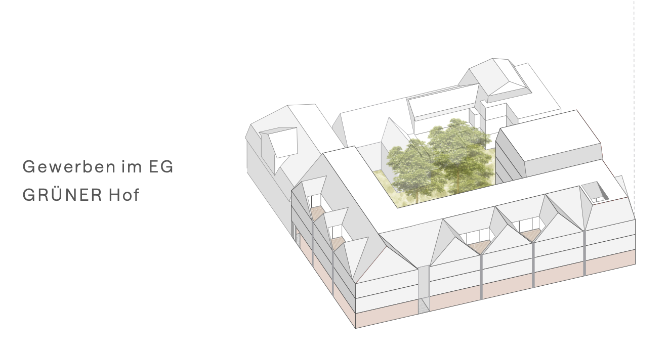 Towards the street, the new building is divided into gabled houses with pitched roofs that reflect the scale and rhythm of the old town. The segmentation into smaller buildings reflects the plot structure of the neighborhood. On the courtyard side, the pitched roofs transform into a flat roof, creating space for photovoltaic systems and retention areas. This architectural duality enables a sensitive integration to the outside and a contemporary openness to the inside.